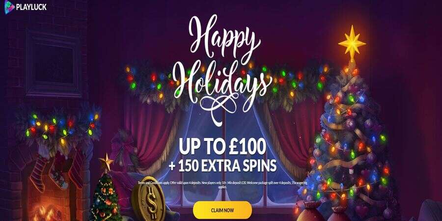 PLAYLUCK CASINO – HAPPY HOLIDAYS PROMOTION (DEPOSIT BONUS UP TO ยฃ100 + 150 EXTRA SPINS)