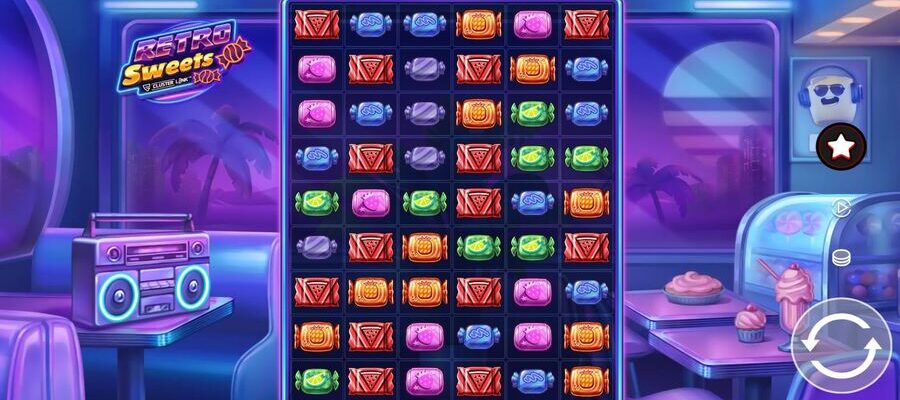 Retro Sweets is played on 6 reels with 9 rows and the paylines are Cluster Pays. The minimum bet level is set at 10p per spin and the maximum bet is £100 per spin. Features include repsins, scatter symbols and multipliers. it is possible to trigger wins in both the base game and the bonus game. Cascading reels are also active in the base game. The volatility of Retro Spins is high and the slot is developed by Push Gaming. Retro Sweets was released on 02/05/2024.