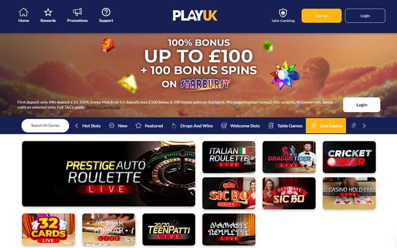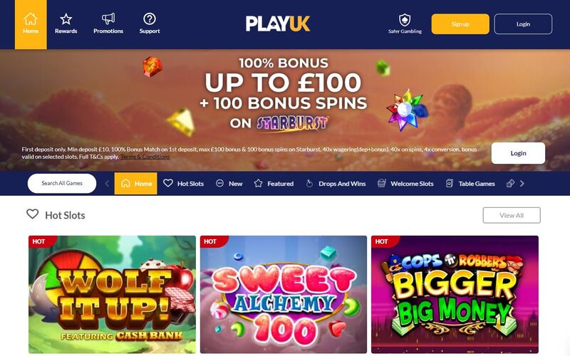 If you are new to PlayUK, you can get a sizeable welcome bonus of up to ยฃ100 and 100 free spins on the slot game Starburst. You can claim the bonus when you make your first deposit of ยฃ10 or more. Just keep in mind that this bonus comes with both win limitations and high wagering requirements (40x).
